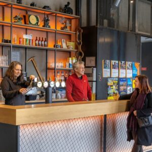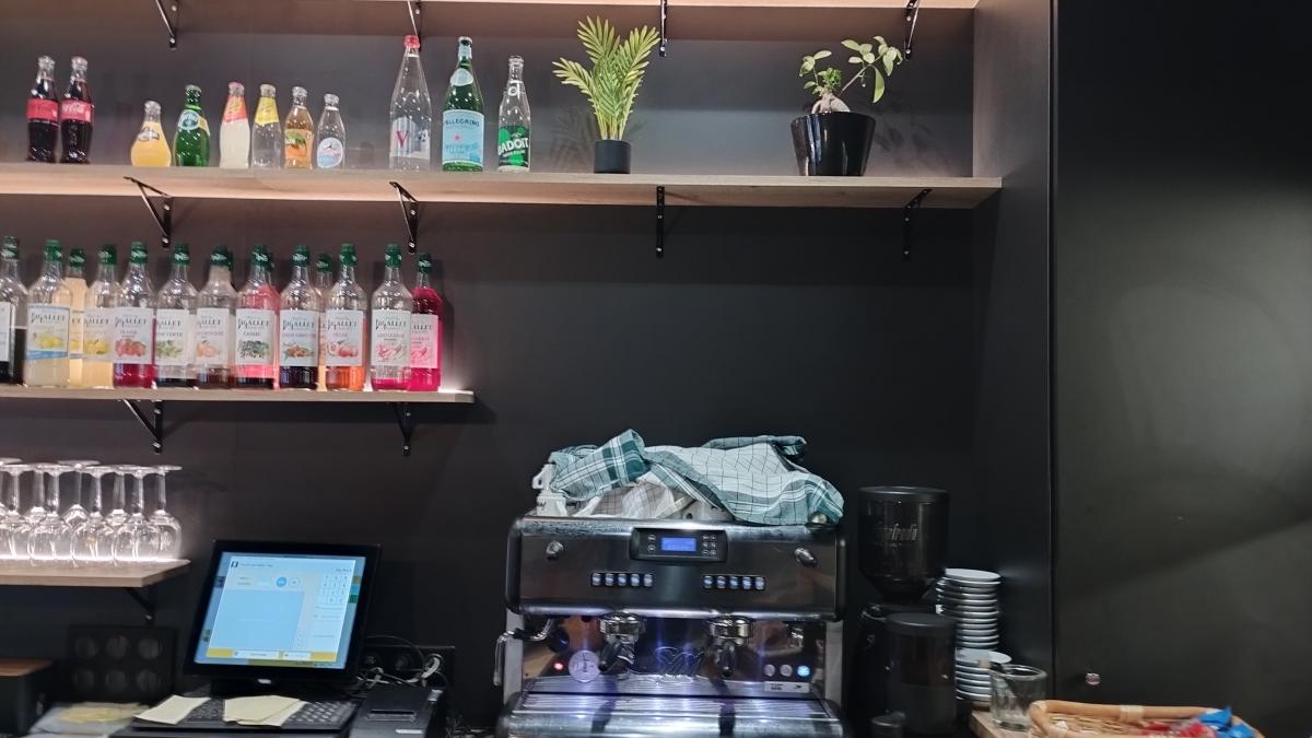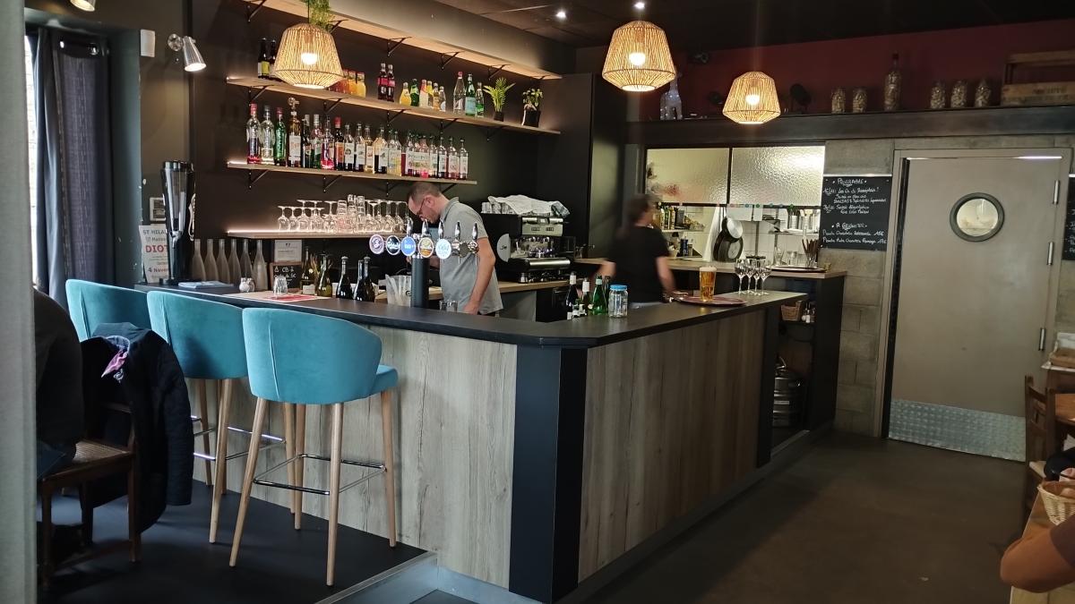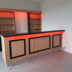 Comptoir un peu technique puisqu'il faut intégrer le groupe bière et les fûts. Egalement on en profite pour mettre en place un grand passe-plat pour la cuisine. Et on termine par un éclairage adapté et subtil !
