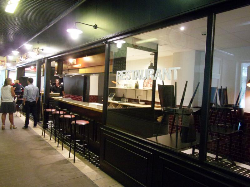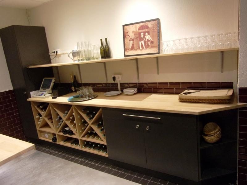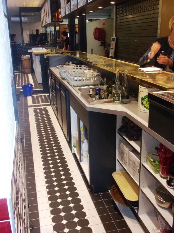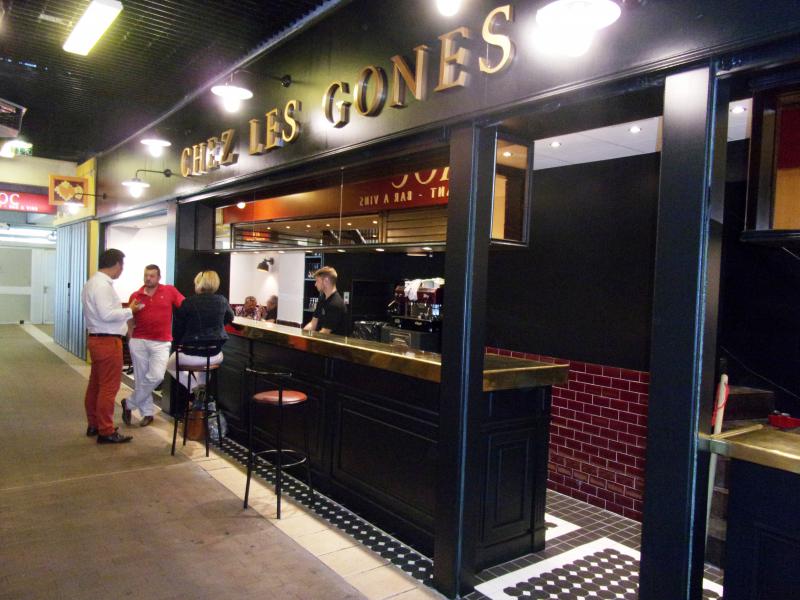 Le projet : Pour cet établissement au cours des Halles de Lyon - Paul Bocuse, nous avons fabriqués un comptoir très travaillé, avec un plateau en laiton. A notre charge également un meuble multi-fonction derrière le comptoir: meuble à desserts, cave à vins, poste de réchauffe, ...